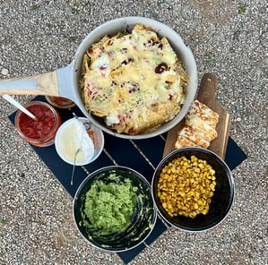 Pan nachos are a fun and easy meal that can be customized with your favorite toppings. Simply layer tortilla chips with cheese, guac, salsa, sour cream, and any other ingredients you love, and heat them on the pan (low-heat and covered with tin-foil).